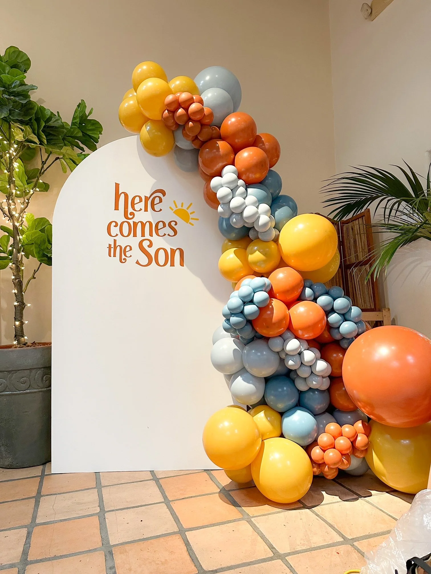 Here Comes the Son {12 ft. garland with a custom decal on our white arch}
