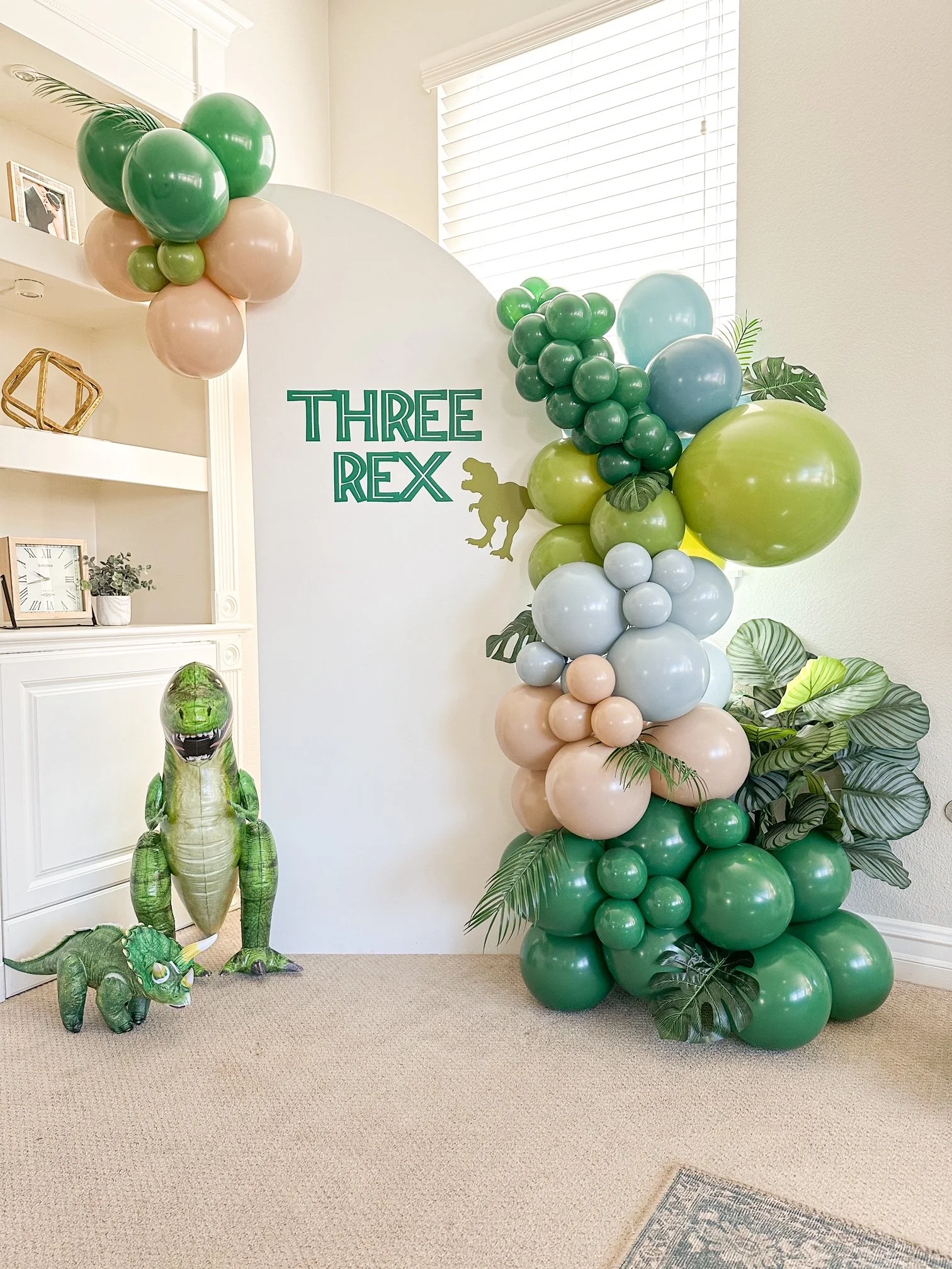 Three Rex Birthday {18 ft. on large white arch + open natural arch, accent dinosaurs and greenery}